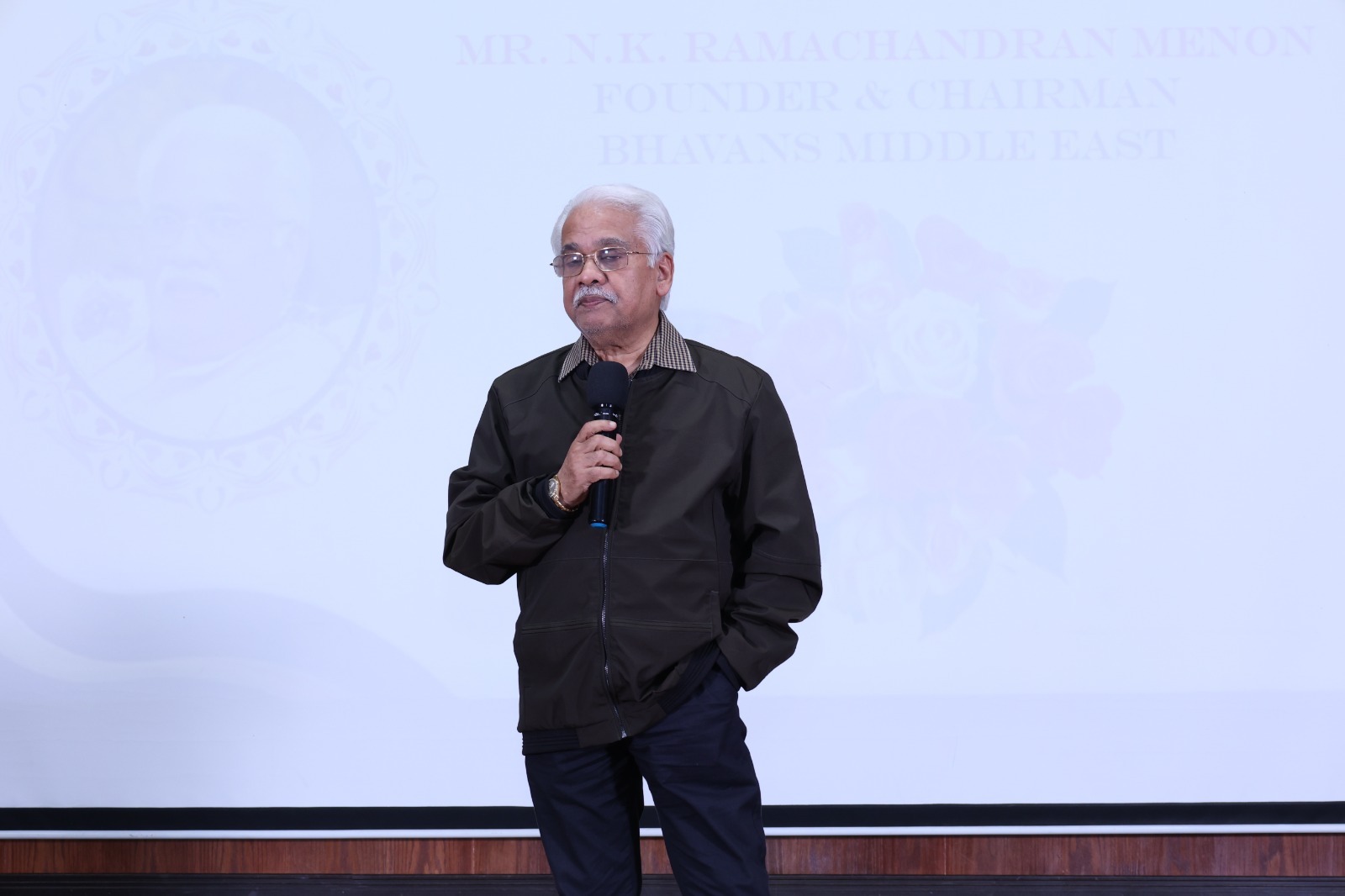 In his special address, Mr. N. K. Ramchandran Menon, Founder and Chairman of Bhavans Middle East, blessed the students and reminded them to honour the efforts and sacrifices invested by their parents in providing them with an excellent education. He advised them to keep in touch with their parents throughout their life. While speaking to the children on exam preparation, the Chairman underscored the importance of getting sufficient sleep during the examination period. Proper rest he said, rejuvenates the mind and body, enhancing cognitive functions such as memory retention, concentration, and problem-solving abilities. He further emphasized the importance of maintaining composure and not allowing panic to interfere with problem-solving. He encouraged students to stay focused and composed as it would enable them to tackle challenging questions with confidence and perseverance.