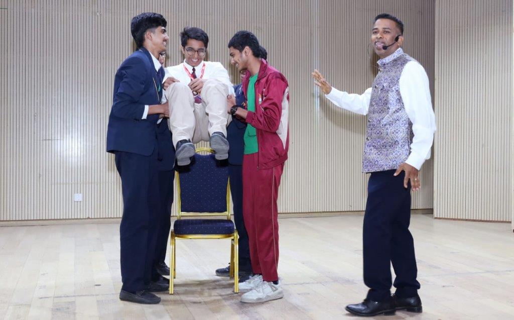 Another fascinating highlight of the session was an experimental demonstration on stage, where Mr. D’Souza showed the incredible impact of mind power. A volunteer from the audience was lifted easily by a group of classmates when they focused their mental and physical energies together. In contrast, when mind power was not synchronized, lifting the volunteer proved to be a challenge, vividly illustrating the immense potential of a focused and aligned mind.