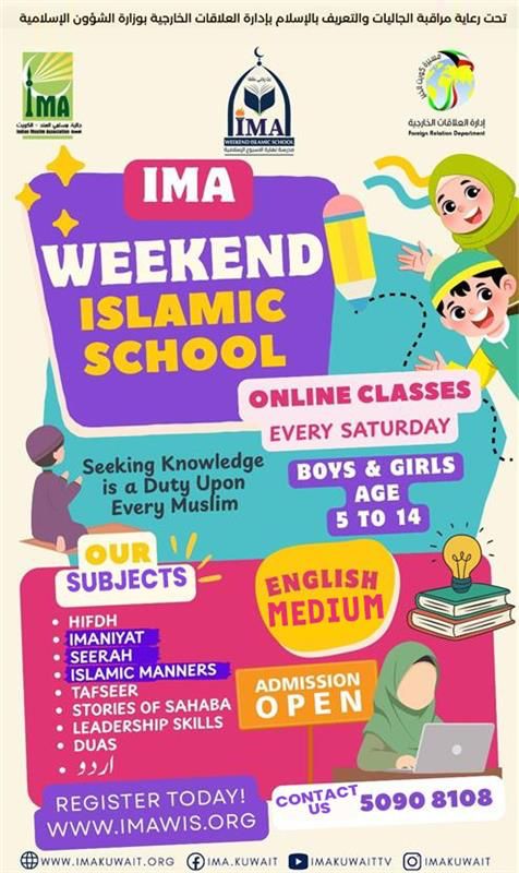 Indian Muslim Association (IMA) Kuwait has announced the opening of admissions for the New Academic Year 2026–2027 of its IMA Weekend Islamic School (IMAWIS), an established initiative aimed at nurturing Islamic Knowledge, Moral Values & Character development among Children.