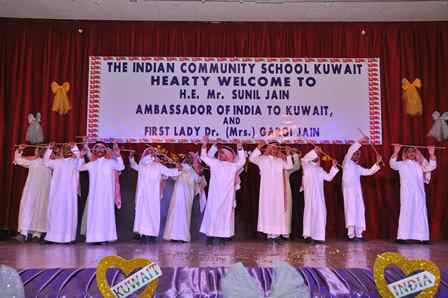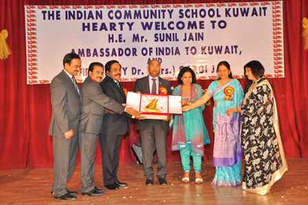 The Indian Community School Kuwait conducted a magnificent ceremony to welcome Indian Ambassador H.E Mr. Sunil Jain and his wife Dr. Gargi Jain to ICSK on 6th May, 2014. It was an incredible evening as a galaxy of dignitaries graced the ICSK Senior Branch auditorium. Remarkable performances by children of the four branches and insightful speeches made it truly memorable occasion for all the guests. The occasion was also special as the school had celebrated its 56th Foundation Day the previous day. The function also coincided with another illustrious milestone in the history of the ICSK as the honorary Secretary Mr. Vijay Karayil declared that the ICSK had received, just a couple of hours back, the permission to be the regional center for National Institute of Open Schooling for the entire Kuwait.