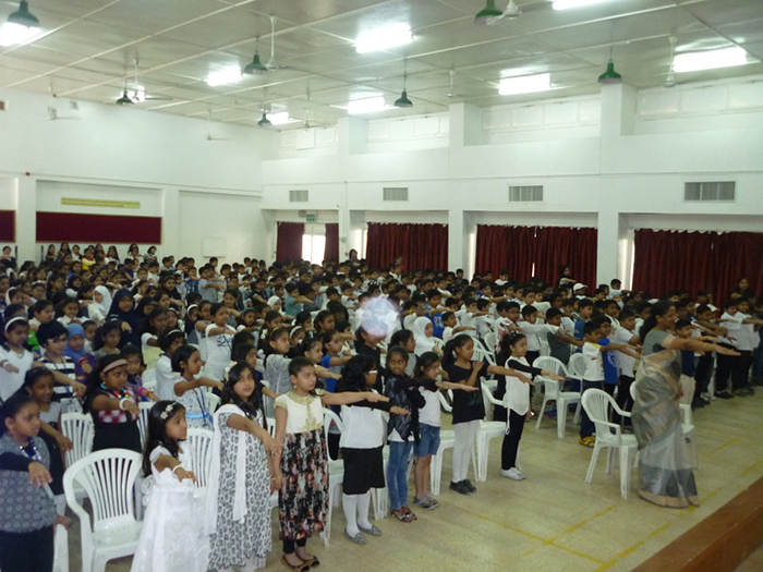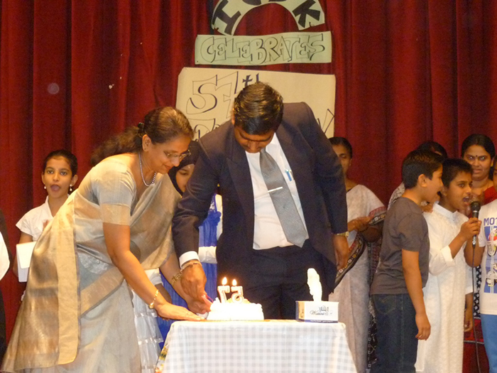 The Indian Community School Kuwait celebrated 57th Foundation Day on 5th May, 2015. Since then, generations of students have entered and exited the portals. ICSK Khaitan celebrated this glorious day with a special assembly. ICSK Khaitan students and staff wore black/blue and white colour combinations to bring back the founding year of 1959 back on the campus. On the occasion of our school’s birthday, Principal of ICSK Khaitan Mr.K.G.Shirsath and Vice Principal Dr. Mary Isaac cut the cake and offered it to the children.