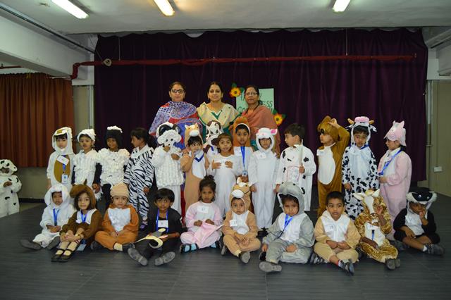 Children had come dressed as different animals and were excited to see one another. Some were dressed as domestic animals like dog, cat, cow, goat, hen , sheep, etc where as others were dressed as wild animals like lion, tiger, elephant, zebra, giraffe etc. Each one spoke about the animal they had dressed up as. Thus, they learnt about different animal in a playful manner.