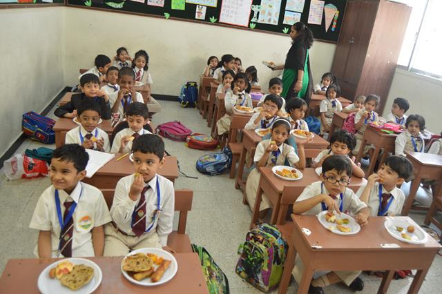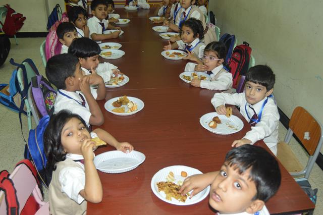 Parents joyfully and enthusiastically sent food for their children. The food was arranged in the class as buffet. Children enjoyed eating variety of tasty food.