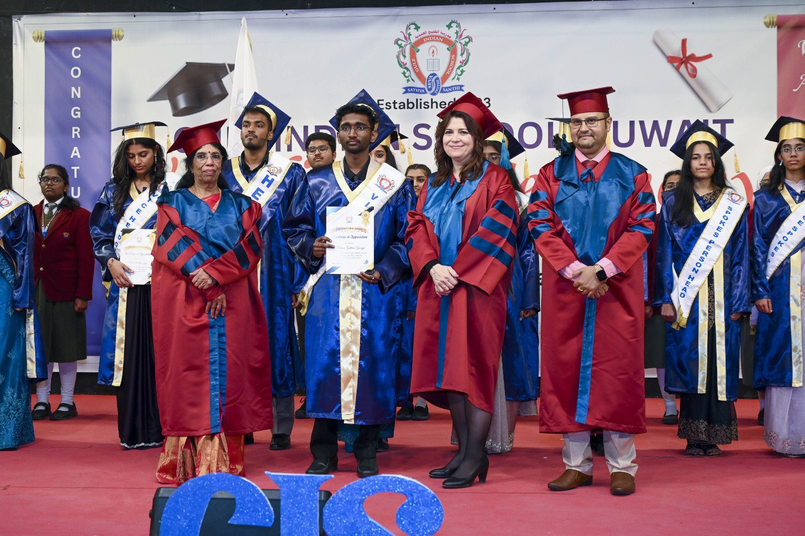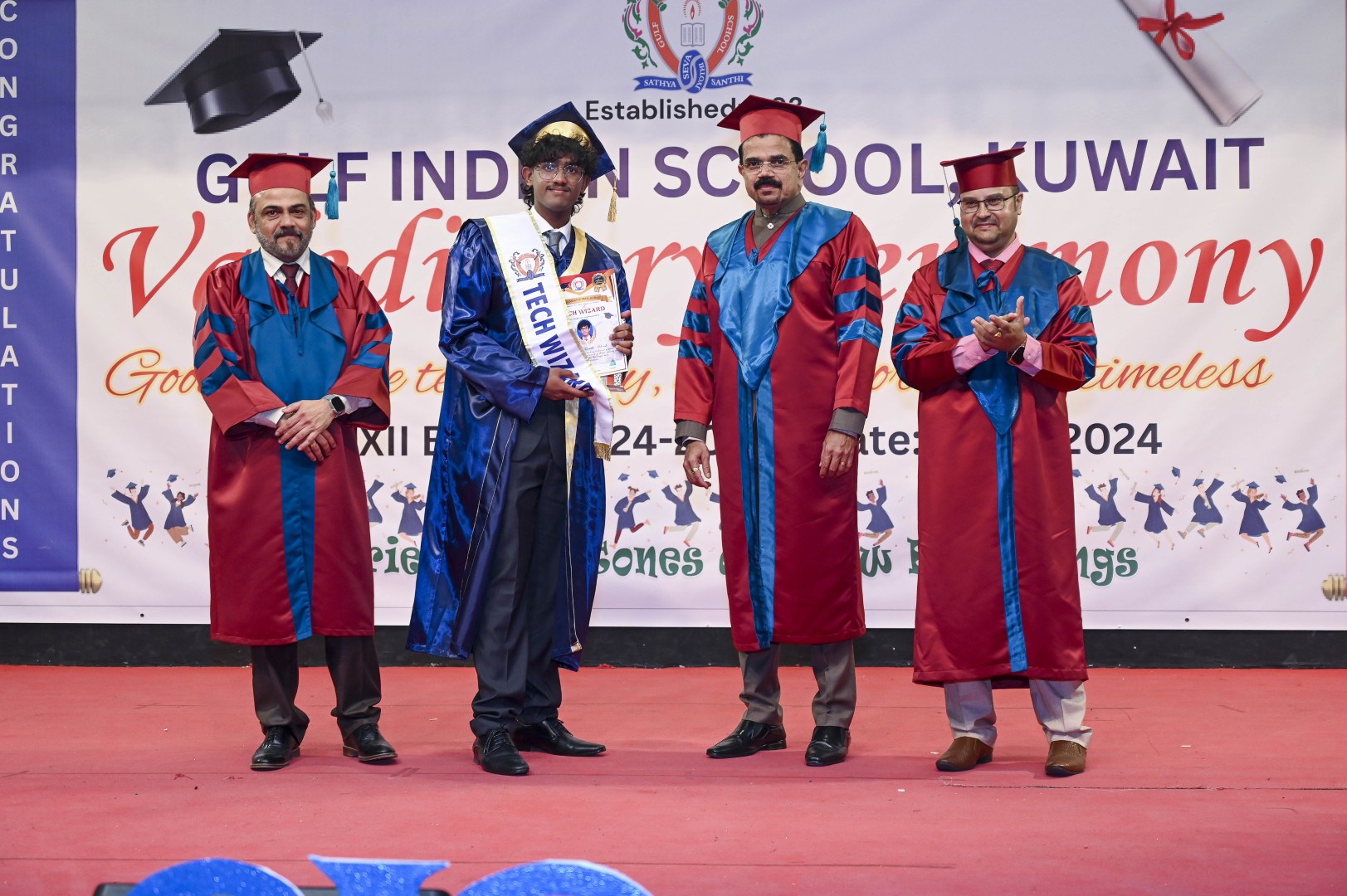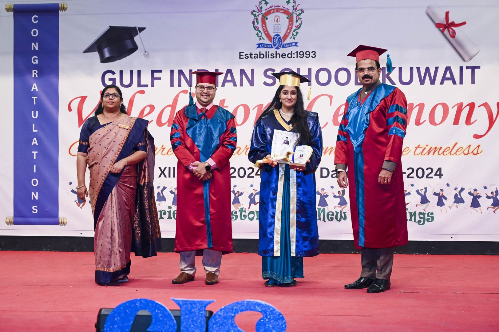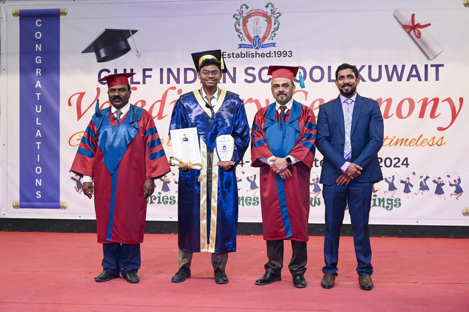 A moment of profound wisdom unfolded as Principal Dr. S. Prashant Vasudev took to the stage, his words resonating with encouragement and boundless hope, urging the graduating class to embrace the vast horizons awaiting them. With deep reflections on the graduating class’s journey, he celebrated their growth and the values of integrity and perseverance that have shaped them. The Principal urged the students to embrace the vast horizons ahead, face challenges with courage, and pursue their dreams fearlessly. He concluded his inspiring address with a heartfelt poem, wishing them success and reminding them that the doors of Gulf Indian School will always be open, their home forever. Then came the most awaited segment—the Convocation Ceremony, where each student, brimming with pride and nostalgia, ascended the stage to receive their certificate and a heartfelt message from the Principal. Applause echoed through the hall as the Special Awards were bestowed upon students, recognizing their stellar achievements, talents, and exemplary attributes.