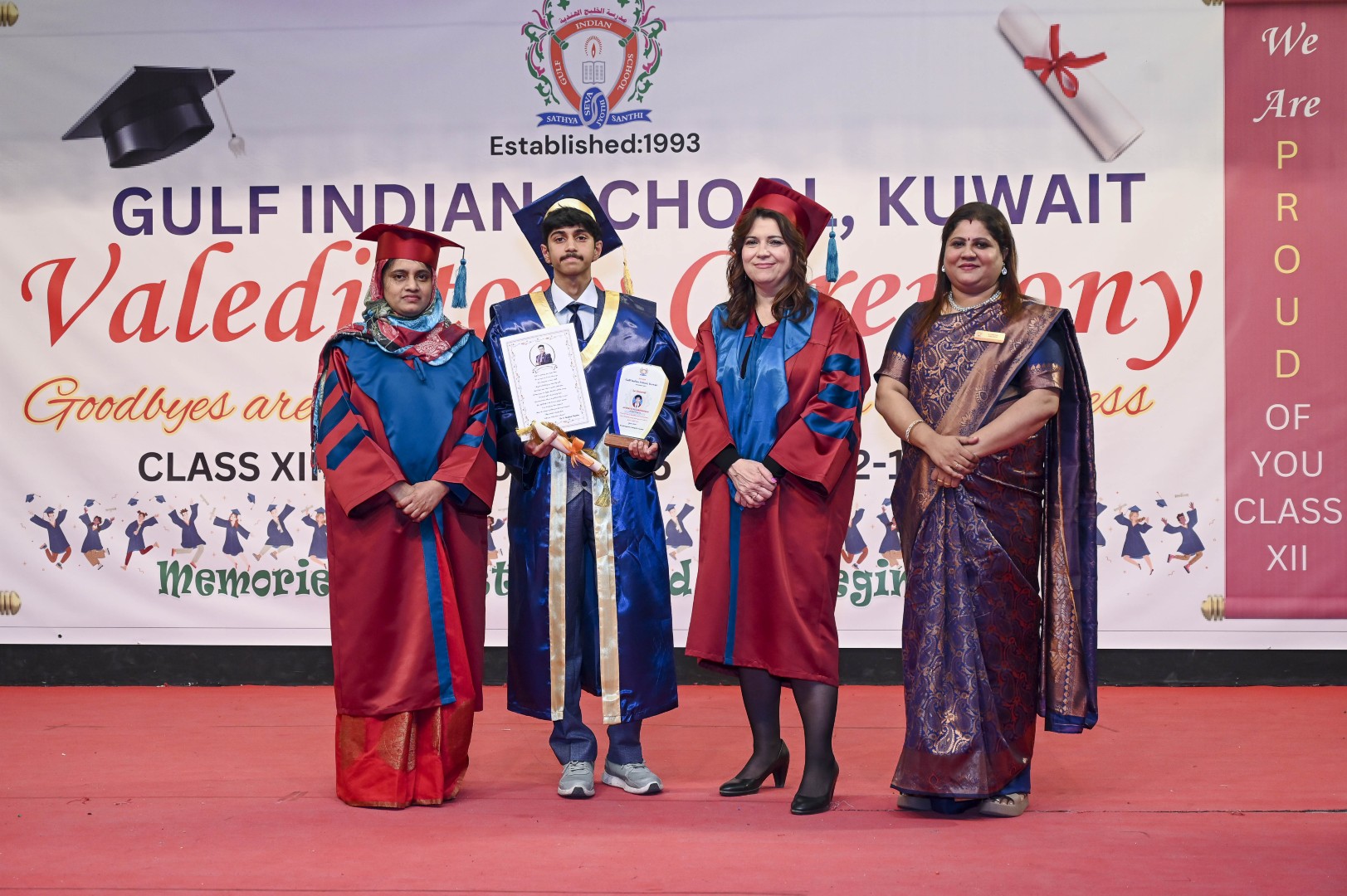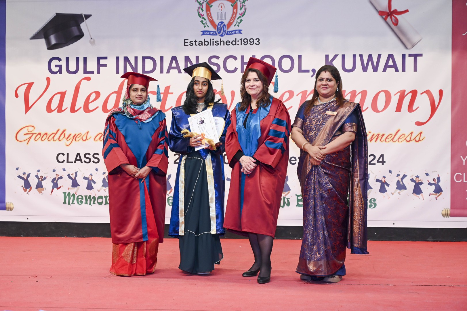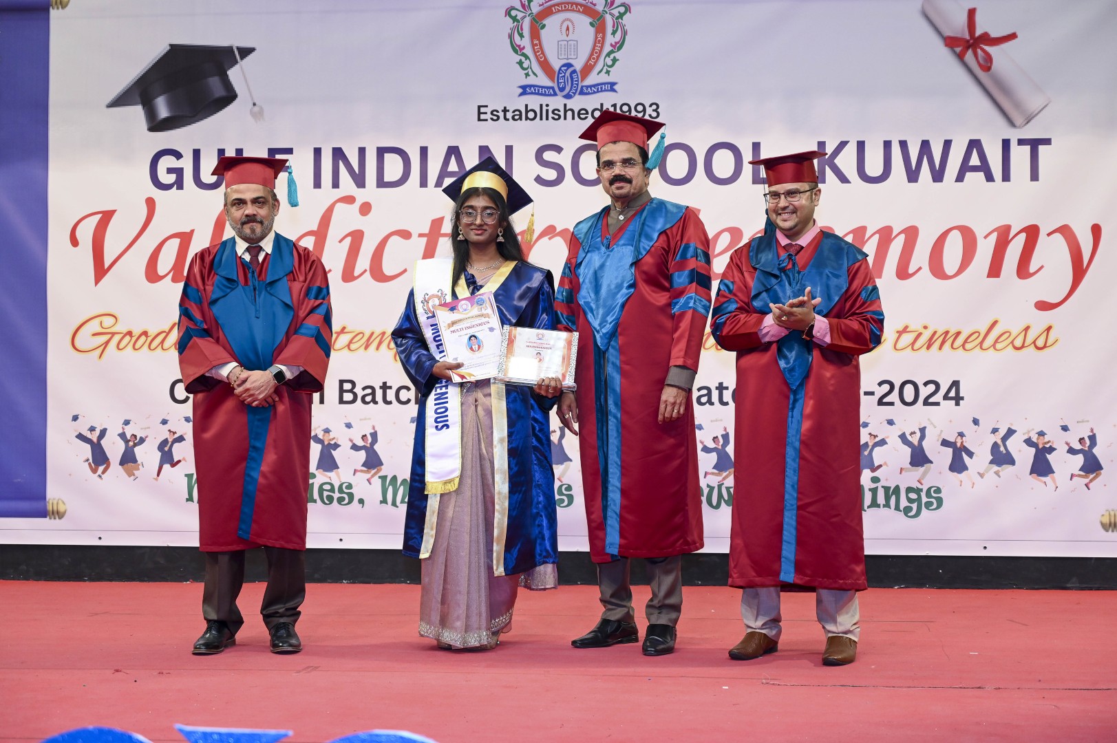The crisp December evening was imbued with anticipation as the valedictorians stood poised, eagerly awaiting the arrival of the esteemed dignitaries. The programme began with a majestic procession of valedictorians, led by the Chief Guest, Mr. Ravi Ayanoli, Principal of Fahaheel Al Wataniah Indian Private School, along with the Guest of Honour, Mr. Sreekumar Pillai, Manager of Gulf Indian School, and other distinguished Special Guests, including Ms. Caroline Flaherty, Principal of Future Bilingual School for Girls, Dr. Mohammed Riaz, Registrar of Internal Medicine at Adan Hospital, Dr. Prashant Vasudev, Principal of Gulf Indian School and Vice Principals. The valedictorians, adorned in their finest attire and exuding confidence, made their way down the aisle, taking their honored seats as the true stars of the evening, signaling the start of a truly memorable celebration. The atmosphere was charged with a palpable sense of pride and unity as a captivating musical performance filled the air, its soulful melodies weaving through the gathering like a soothing breeze. The harmonious notes resonated deeply, evoking emotions of joy and nostalgia, while binding everyone together in a shared celebration of the moment. The event’s energy soared with a mesmerizing dance performance, its graceful movements and refined artistry imbuing the night with elegance and vitality, captivating the audience with every intricate step and harmonious flow.